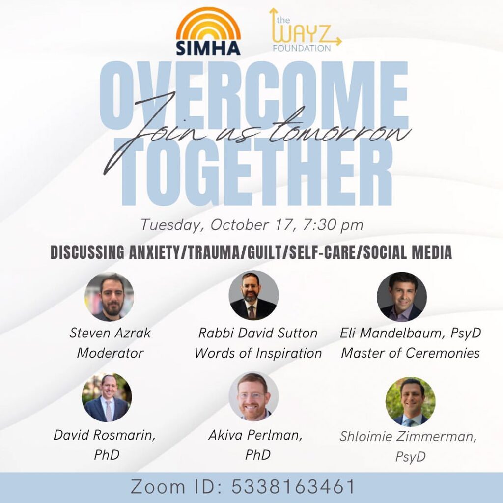 Overcome Together – Discussing anxiety, trauma, guilt, self-care, & social media. #WestandwithIsrael – R’ David Sutton, Dr. David Rosmarin, Dr. Akiva Perlman, & Dr. Shloimie Zimmerman – Moderated by Dr. Eli Mandelbaum & Steven Azrak – SIMHA – WAYZ Foundation – October 2023 #Anxiety #Trauma #Resilience #Meaning #Purpose #Judaism #Speech