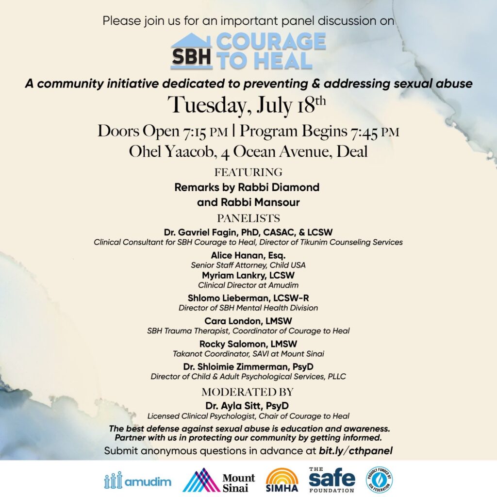A community initiative dedicated to preventing & addressing sexual abuse. Panel discussion. Remarks by Rabbi Shlomo Diamond and Rabbi Eli Mansour Panelist: Dr. Gavriel Fagin, PhD, CASAC, & LCSW, Alice Hanan, Esq., Myriam Lankry, LCSW, Shlomo Lieberman, LCSW-R, Cara London, LMSW, Rocky Salomon, LMSW, and Dr. Shloimie Zimmerman, PsyD Moderated by Dr. Ayla Sitt, PsyD. …