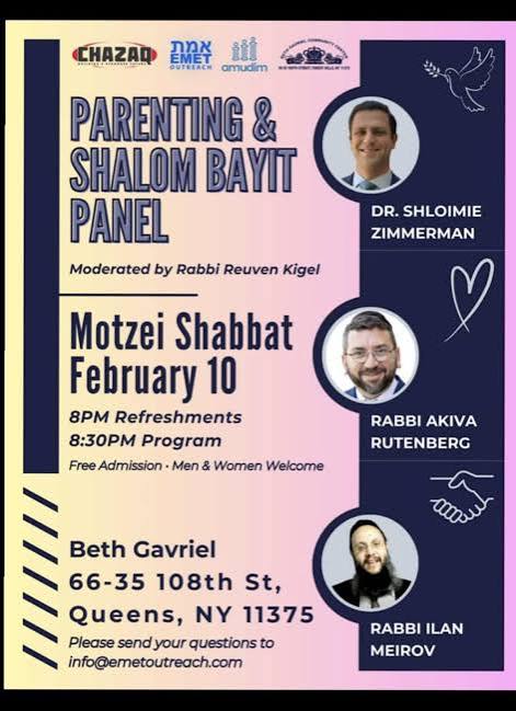 Parenting and Shalom Bayis Panel – Dr. Shloimie Zimmerman, R’ Akiva Rutenberg, & R’ Ilan Meirov – Moderator R’ Reuven Kigel – Chazaq, Emet, Amudim, Beth Gavriel – February 2024 #Parenting #Marriage #Communication #Gottman #Technology #Speech